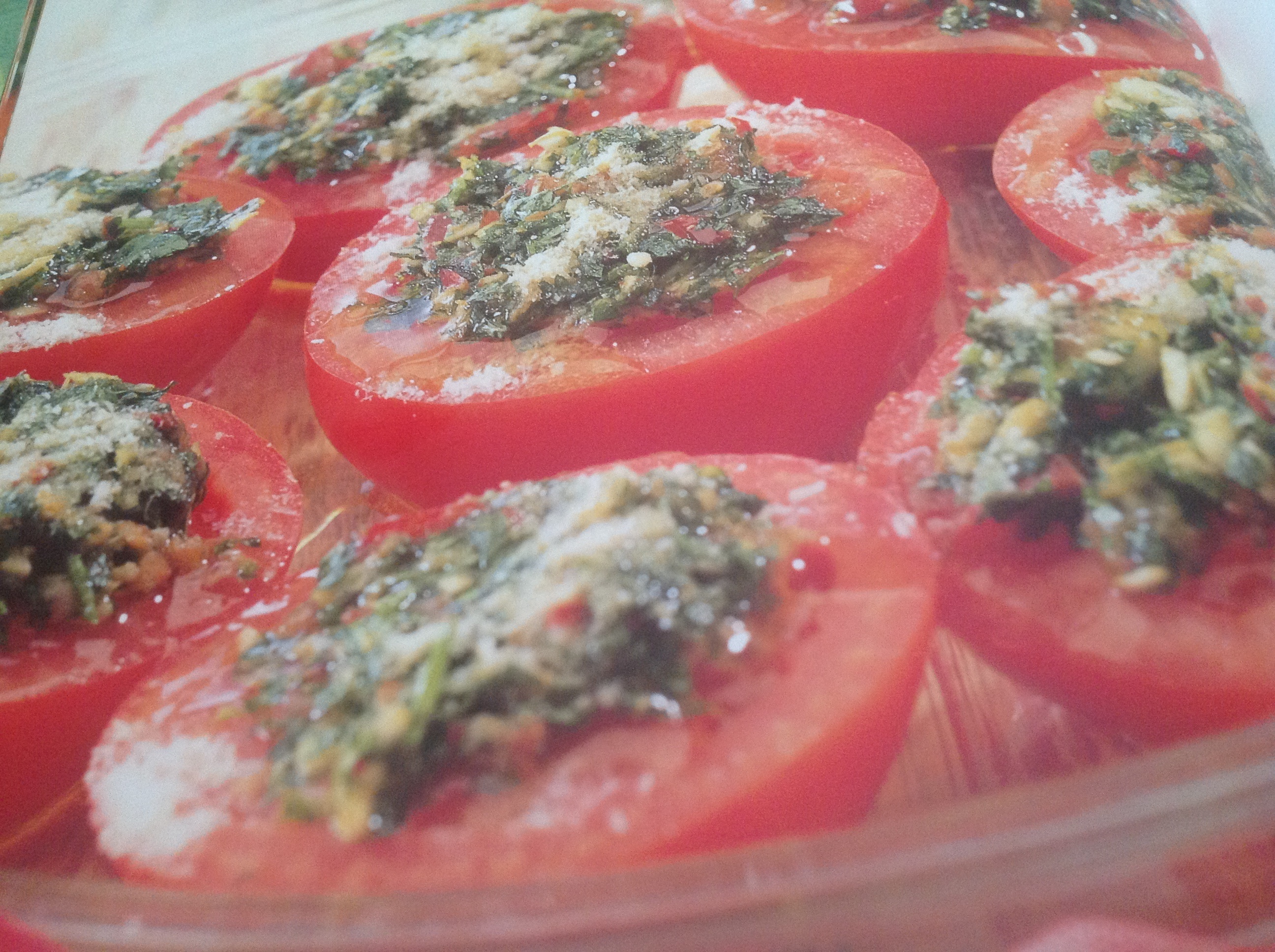 Tritate i pinoli con le mandorle ed i pistacchi, metteteli sopra ad ogni pomodoro e per ultimo cospargete con il pane grattugiato.