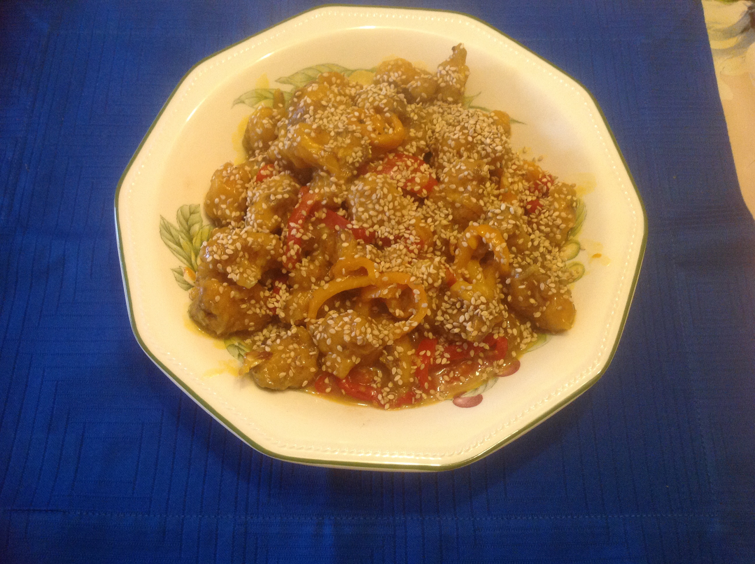 In una padella capiente versate un cucchiaio dell’olio che avete usato per friggere e immediatamente l’aglio, lo zenzero, la buccia di arancia grattugiata, la pasta di peperoncini e i peperoni, unite il brodo, la salsa di soia e il succo delle arance. In una ciotolina stemperate la maizena con un dito di brodo e unitela alla salsa che bollendo rapprenderà . Aggiungete i cavolfiori e rigirateli per due minuti. Spegnete e impiattate. Decorate con i semi di sesamo e servite con il riso pilaf.