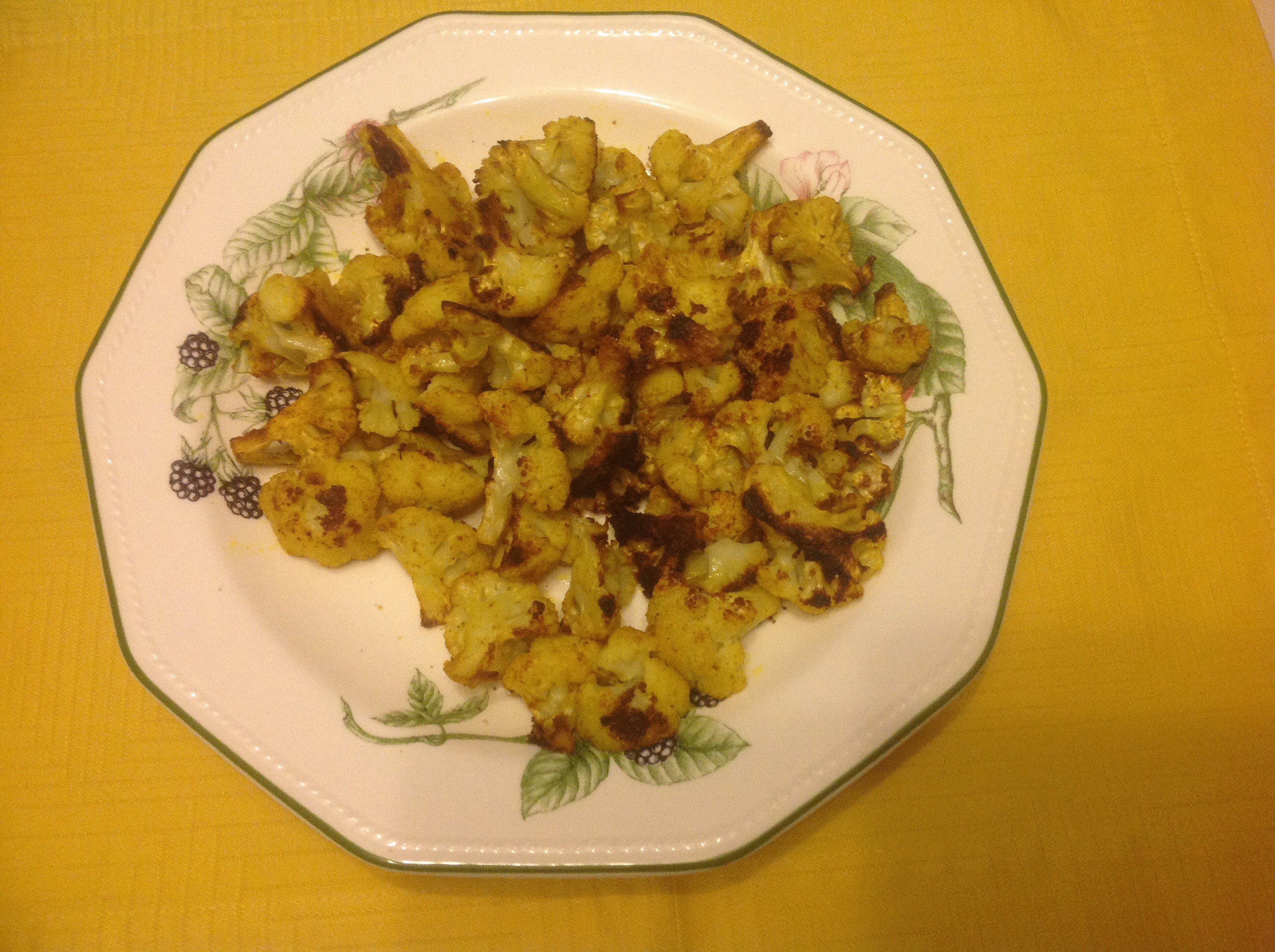 Accendete il forno alla massima temperatura, il mio arriva a 230º. Prendete un pezzo di carta forno sufficiente a foderare la teglia del forno. Sfogliate il cavolfiore lasciando le rose più integre che potete e di piccole dimensioni. Disponeteli sulla teglia e versate sopra l’olio, con le mani cercate di bagnare tutte le rose. Mischiate tutte le spezie con il sale e ricoprite, sempre aiutandovi con le mani, i pezzetti di cavolfiore. Tagliate a quadretti le cipolle e distribuitele sulla superficie a casaccio. Infornate per 25-30 minuti, continuando a rigirarli con l’aiuto di un cucchiaio. Quando saranno ben dorati e croccanti, il piatto sarà pronto.