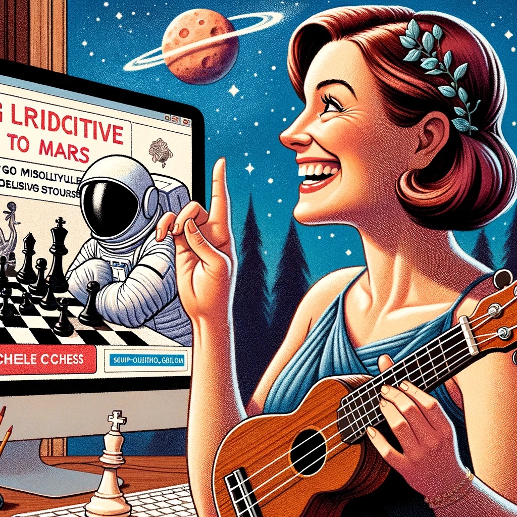 Riesco a immaginarmi a una festa. Tra un boccone di una deliziosa tartina e l’altro, qualcuno mi offre un pass per un viaggio su Marte, con partenza immediata. “È un’occasione unica nella vita!” esclamo con occhi brillanti di entusiasmo. Ma poi, mi ricordo dell’obiettivo di imparare finalmente a suonare l’ukulele. Che faccio, dico “no, grazie”, con la tranquilla determinazione di chi sa che Marte non offre corsi di ukulele? Chi se ne frega del corso di ukulele…🤣