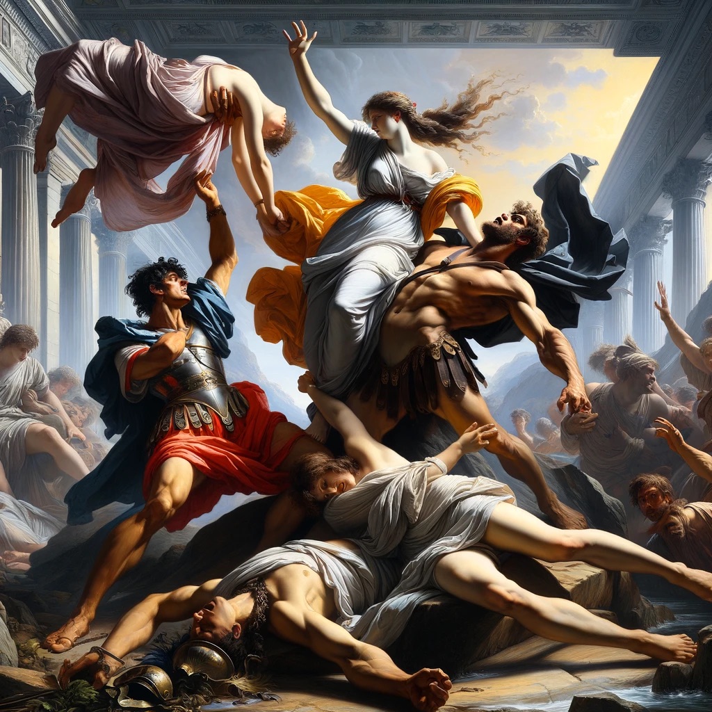 La leggenda narra che Romolo, il fondatore di Roma, per aumentare il numero dei suoi cittadini, organizzò un grande festival in onore del dio Nettuno e invitò i vicini popoli Sabini, tra gli altri. Durante i festeggiamenti, i Romani, seguendo un segnale convenuto, rapirono le donne Sabine, donne che erano state invitate con i loro familiari. Questo atto brutale aveva lo scopo di assicurare la progenie e l’integrazione delle comunità limitrofe nella nuova città di Roma.