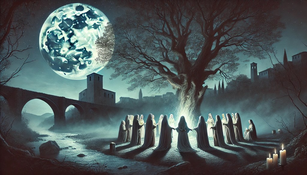 Il mito della Strega di Benevento risale a tempi antichissimi, quando Benevento era un importante centro del popolo sannita. Secondo la leggenda, le streghe, conosciute come “janare”, si riunivano sotto un grande albero di noce lungo le rive del fiume Sabato. Qui, durante le notti di luna piena, si dice che danzassero e celebrassero riti magici, invocando spiriti e forze sovrannaturali.