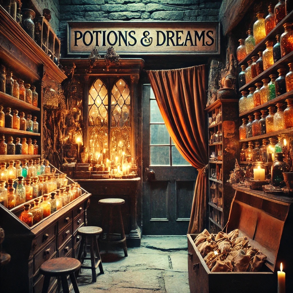 Se dovessi aprire un negozio, sarebbe nascosto in un piccolo vicolo lontano dal frastuono delle strade principali, un luogo segreto che solo i cuori più curiosi riuscirebbero a trovare. Immagino già la porta di legno antico, con sopra un’insegna scolorita dal tempo che recita: “Pozioni & Sogni”. Il mio negozio non sarebbe grande, ma ogni angolo sarebbe intriso di mistero e magia.